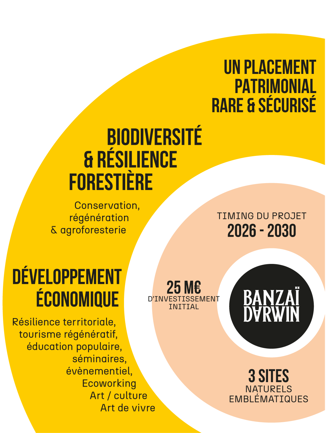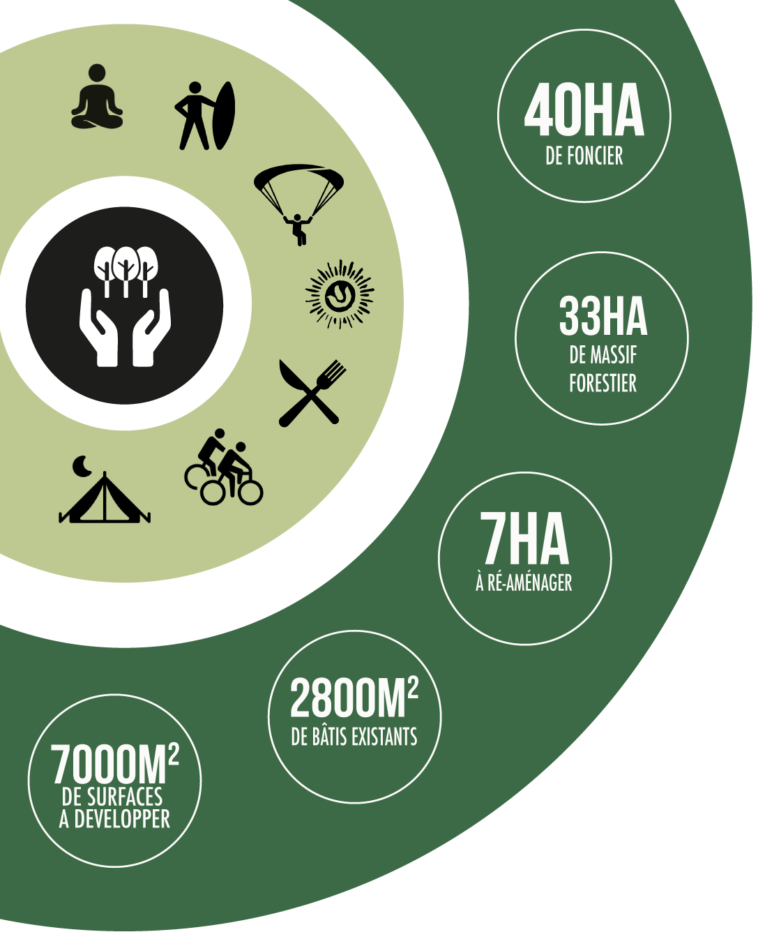 Chaque site est structuré en deux zones : une zone d’activation (écotourisme, culture, pédagogie, hospitalité sobre à haut standar écologique) et une zone de conservation (forêts, dunes, zones humides, agroforesterie, puits de carbone).